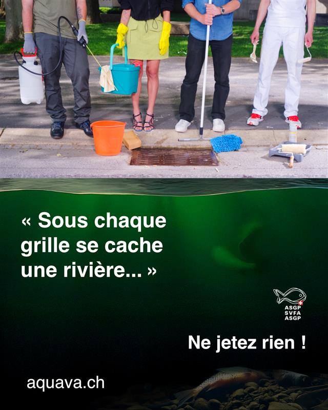 C’est pourquoi Valbroye diffuse la campagne « Sous chaque grille se cache une rivière » initiée par l’Association Suisse des Gardes-pêche. Nous vous invitons à consulter le site internet aquava.ch, qui présente entre autres les gestes et comportements que chacune et chacun peut adopter afin de contribuer à la protection de l’un des biens les plus précieux de l’humanité : L’EAU.